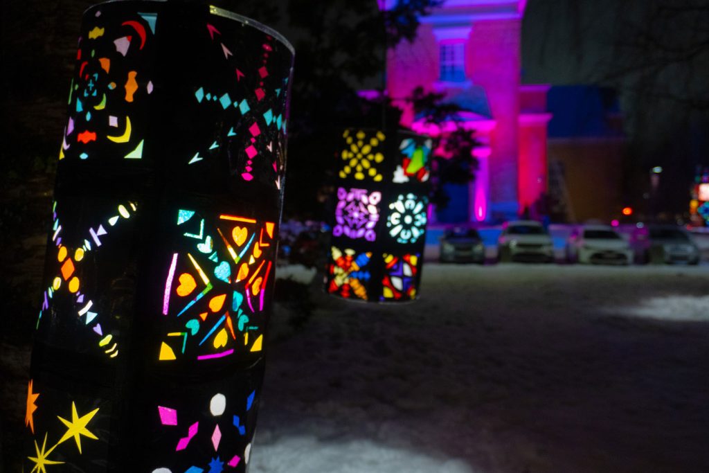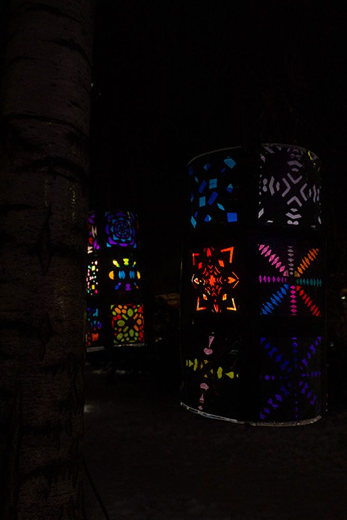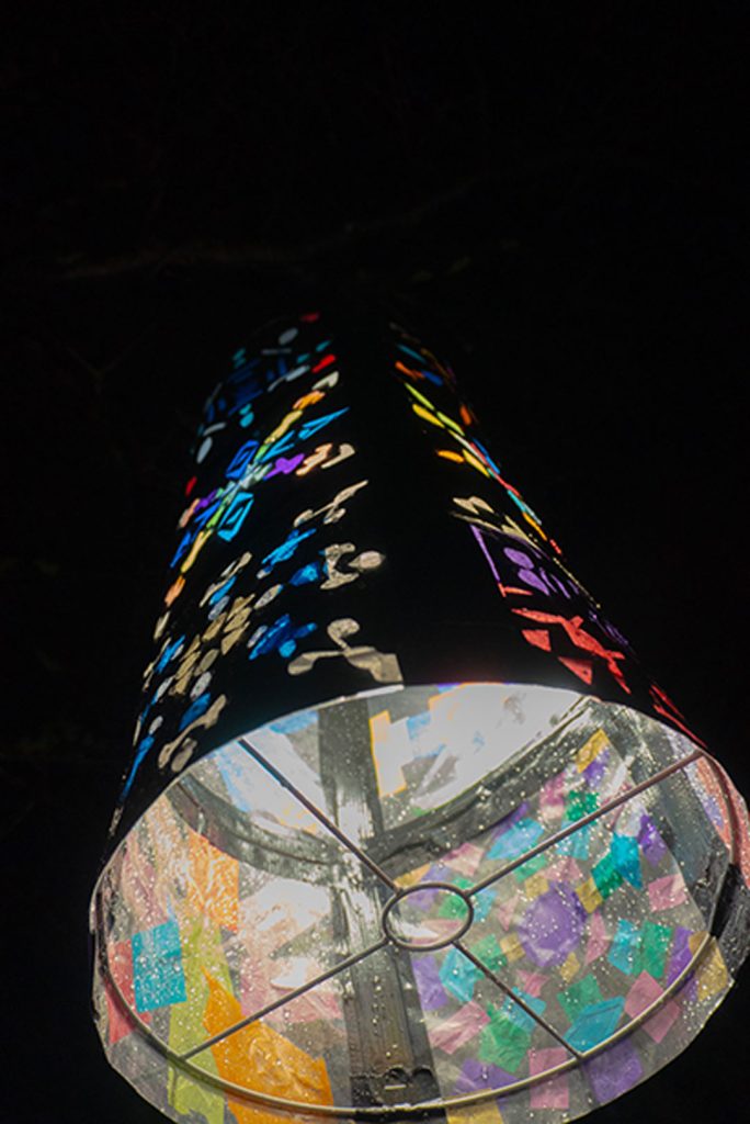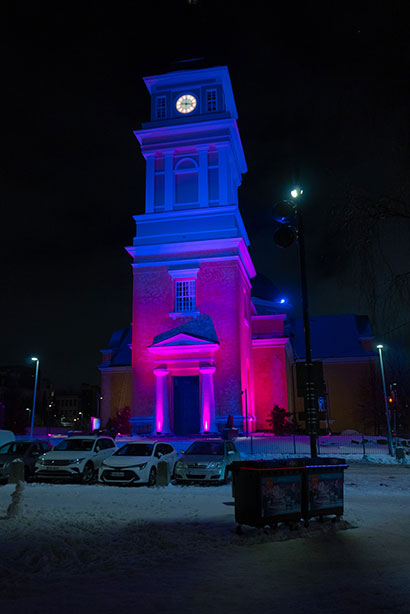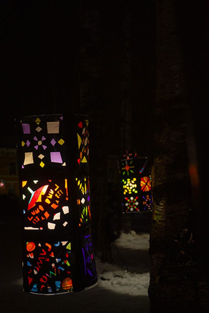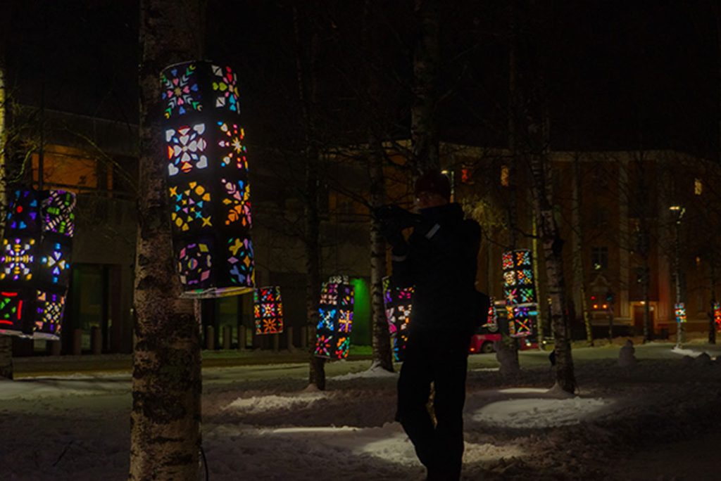 Kävin Franzenin puistossa lauantaina kello 21–22 välillä kiertelemässä puistoa ja katsomassa teosta. Myös viereinen kirkko oli valaistu kauniisti. Samoin myös alueella olevissa roskakoreissa oli LED-valot.