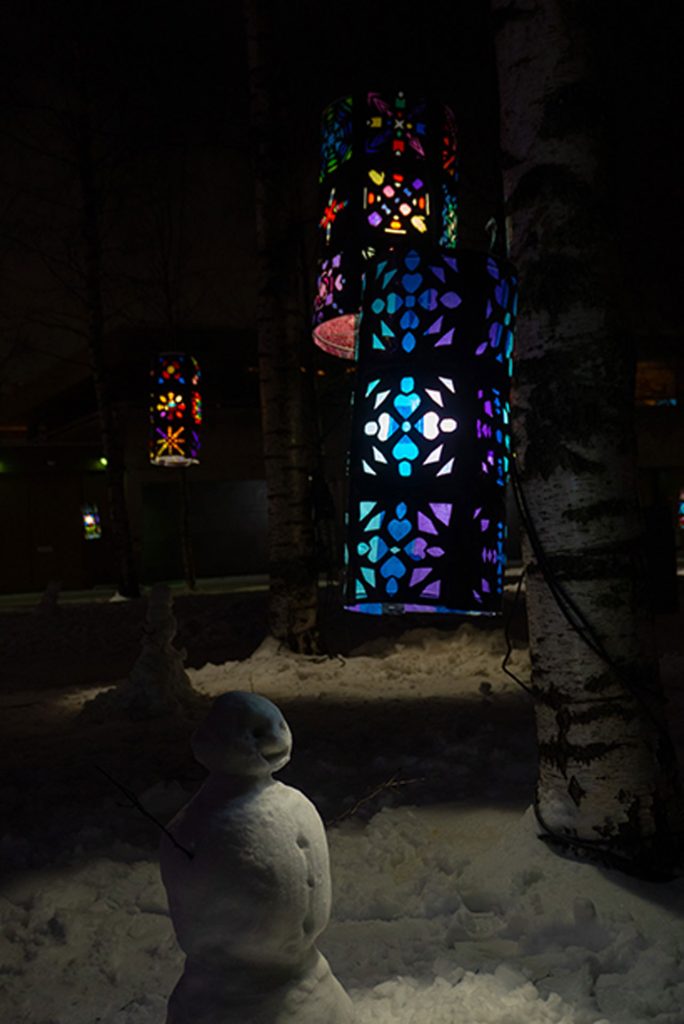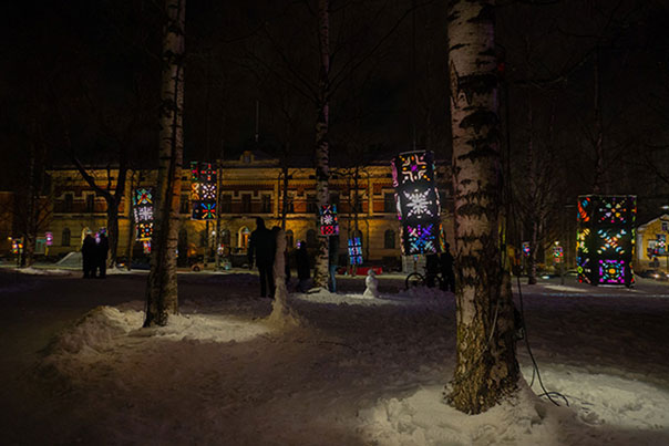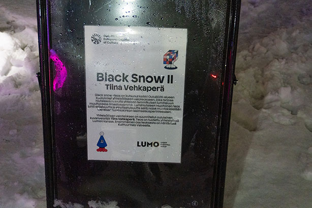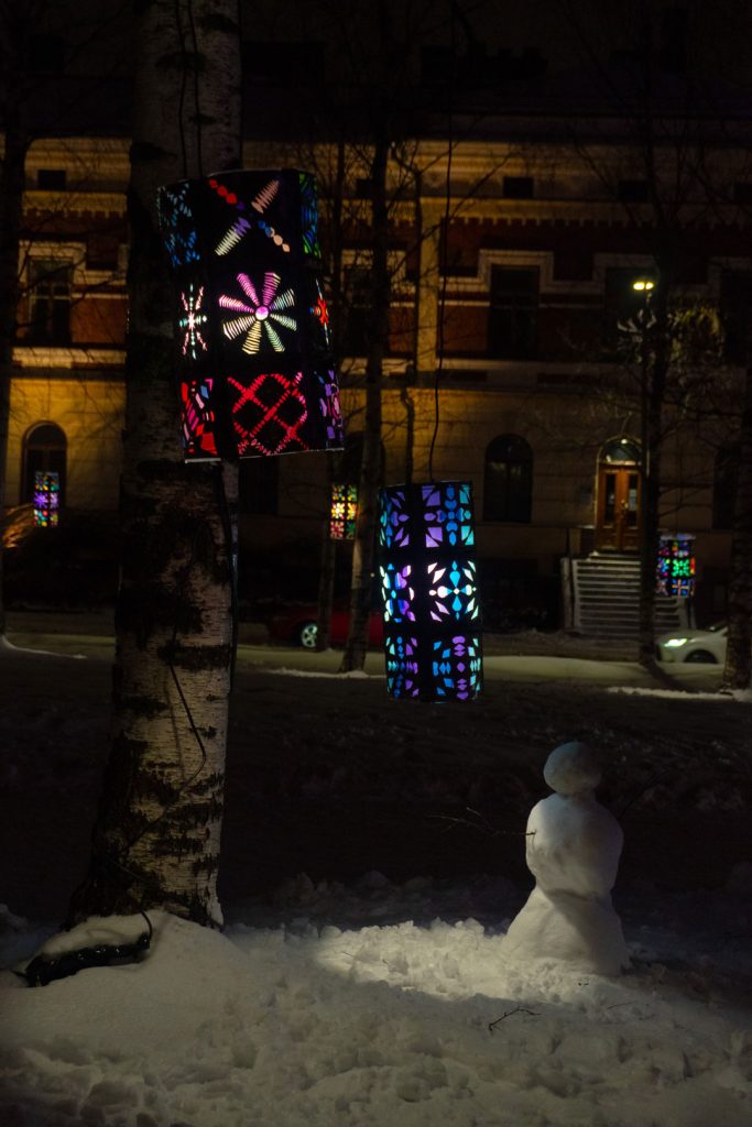 Viikonlopun aikana oli monenlaista tapahtumaa, joista itse kävin katsomassa LUMO Black Snow II teoksen. Black Snow II oli teos, joka sijaitsi Franzenin puistossa. Teoksen teema juhlii erilaisuutta, ainutlaatuisuutta ja teoksessa näkyvät hiutaleet tarjoavat lumitakuun tammikuulle. Sen tekijä oli Tiina Vehkaperä yhdessä Lumon kanssa.
